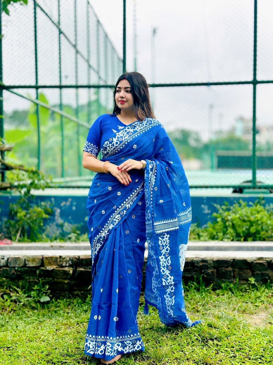 শাড়ির সাথে সেম ম্যাচিং ব্লাউজ পিস রয়েছে, যা আপনার স্টাইলকে সম্পূর্ণ করে।